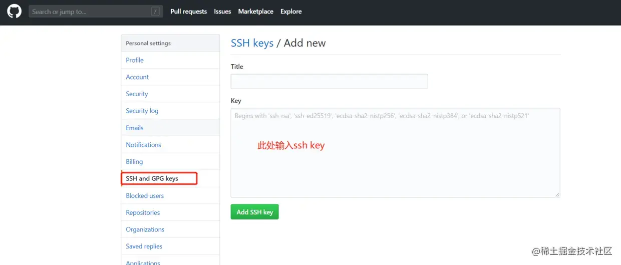 - 最后将id_rsa_test.pub里的内容粘贴到github服务器的指定位置上