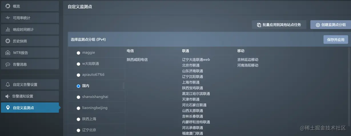 - 在监测点列表右上角单击批量应用到其他站点任务。