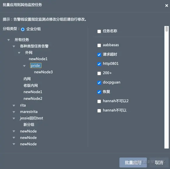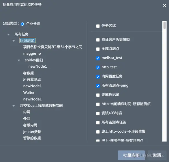 - 在弹出的对话框中通过监控任务分组筛选任务,并勾选批量应用的目标任务,单击批量应用。