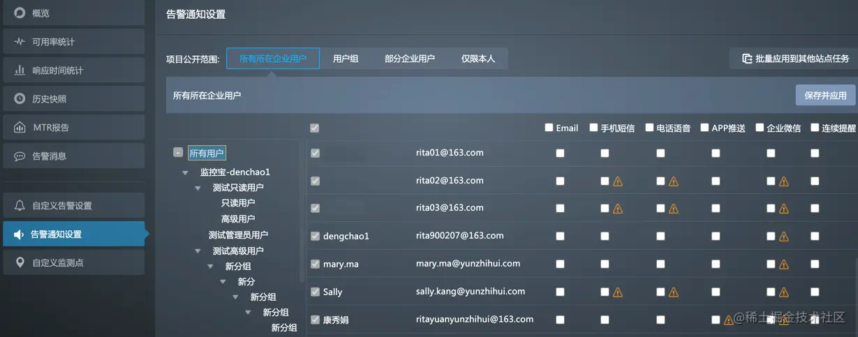 - 在左侧导航中选择告警通知设置,页面展示当前任务的告警通知人。