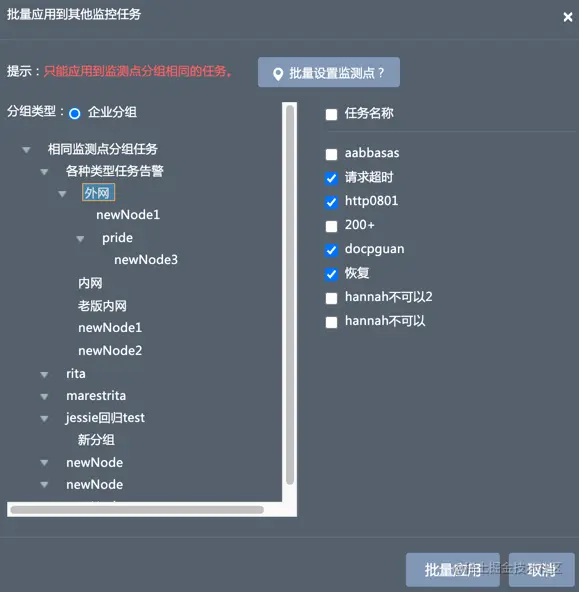 注意:批量应用前,请提前进行监测点批量修改使得批量设置目标任务的监测点相同,详情参考批量设置监测点。