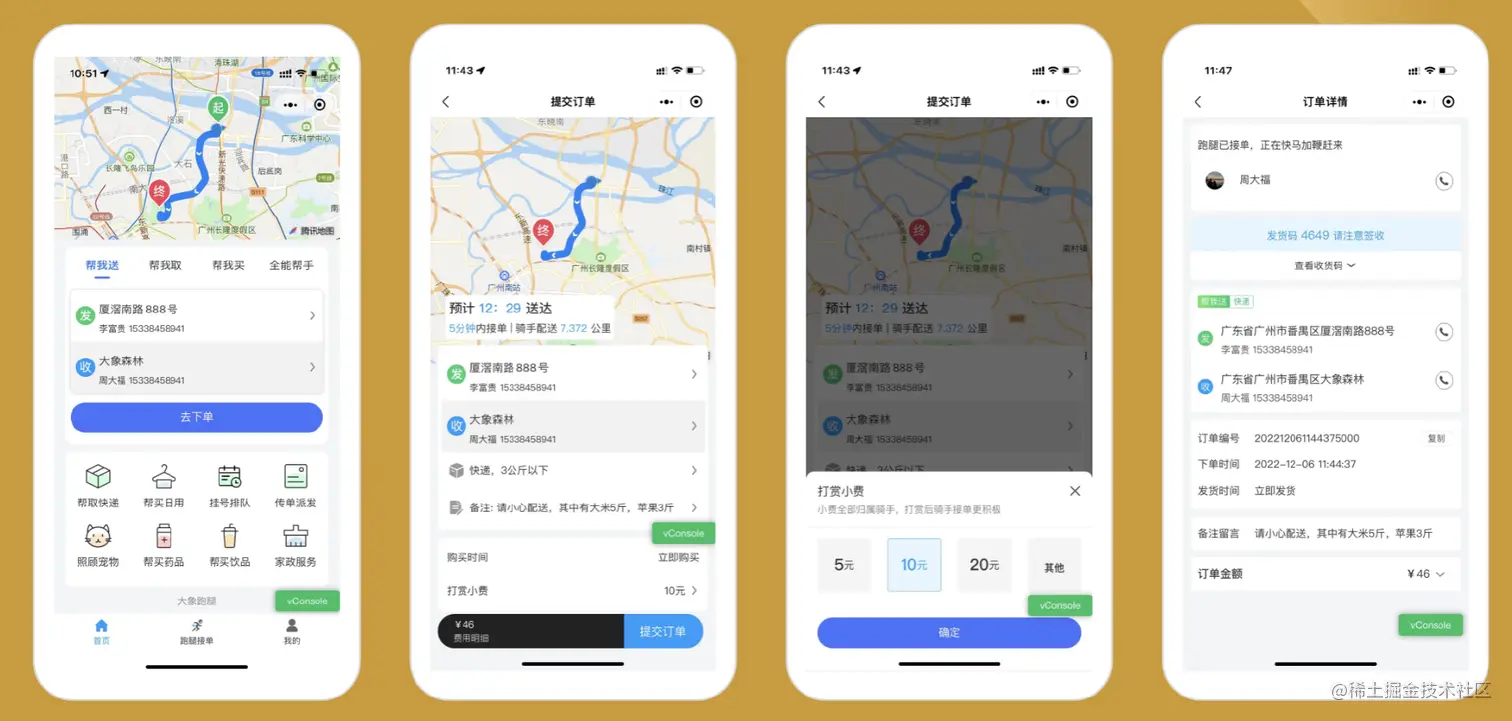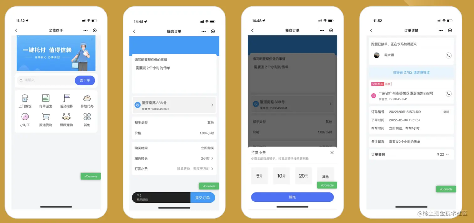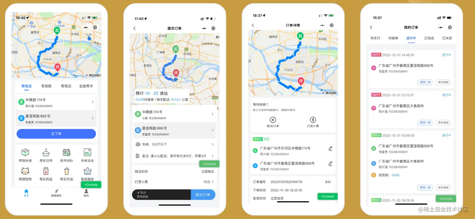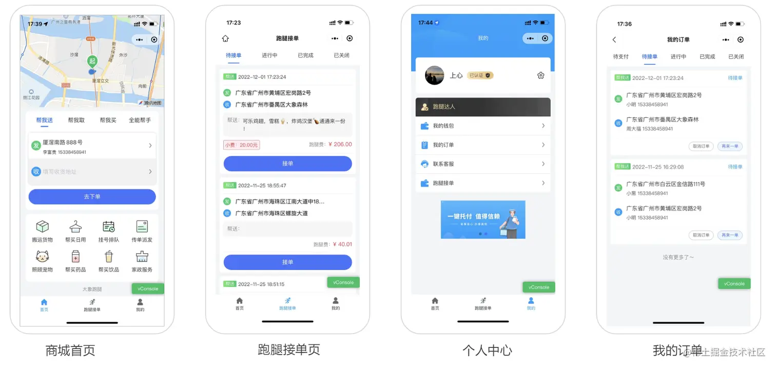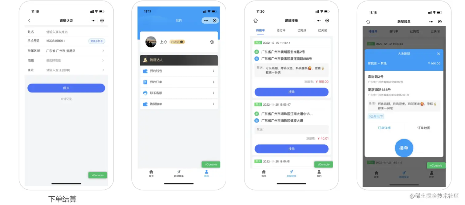 首页、接单、个人中心、我的订单等功能,流畅的接单流程,先申请跑腿资格,审核通过后即可接单