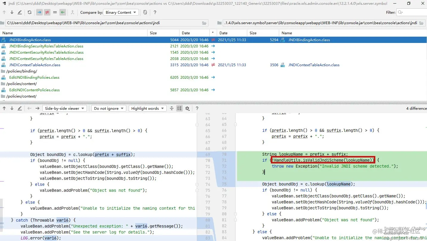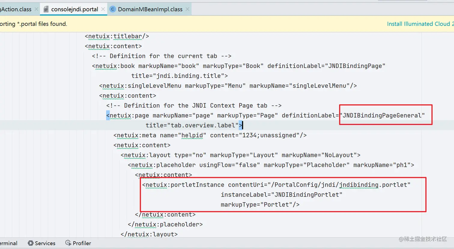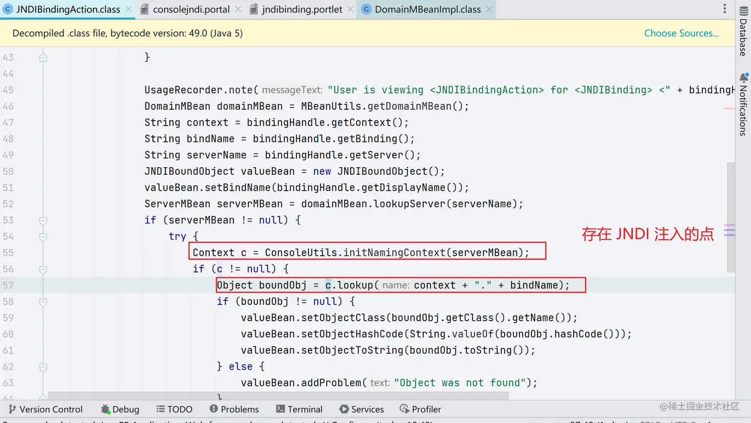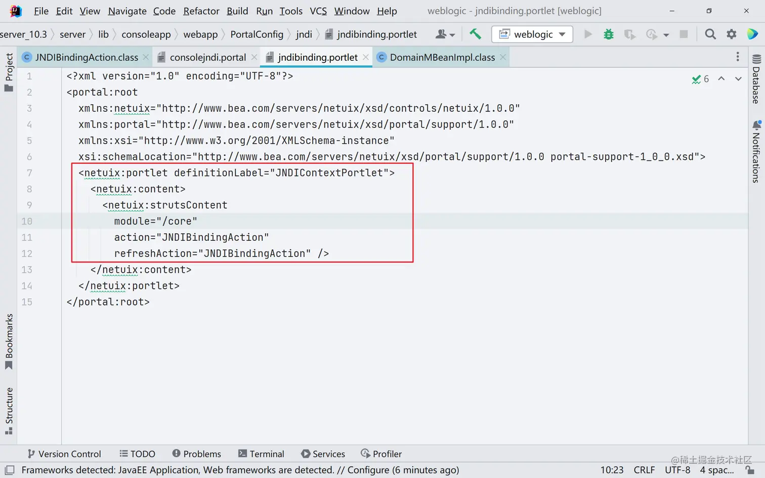 根据 payload 分析,先从 consolejndi.portal 开始看起,.portal 文件就类似于一个 servlet,在 consolejndi.portal 中存在 JNDI Binding 操作的处理容器,如图