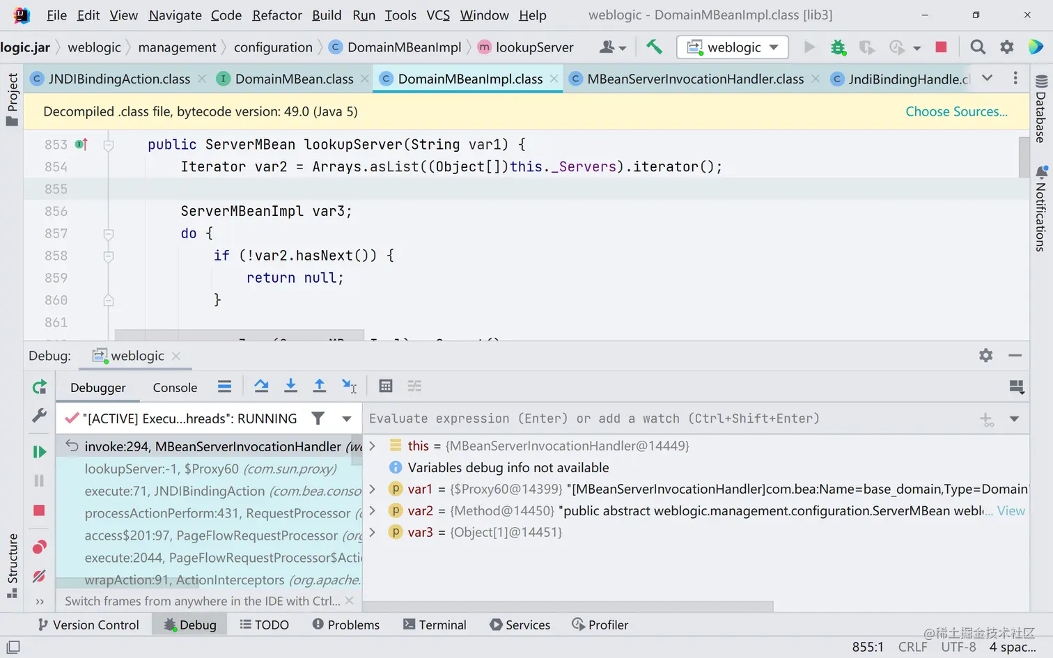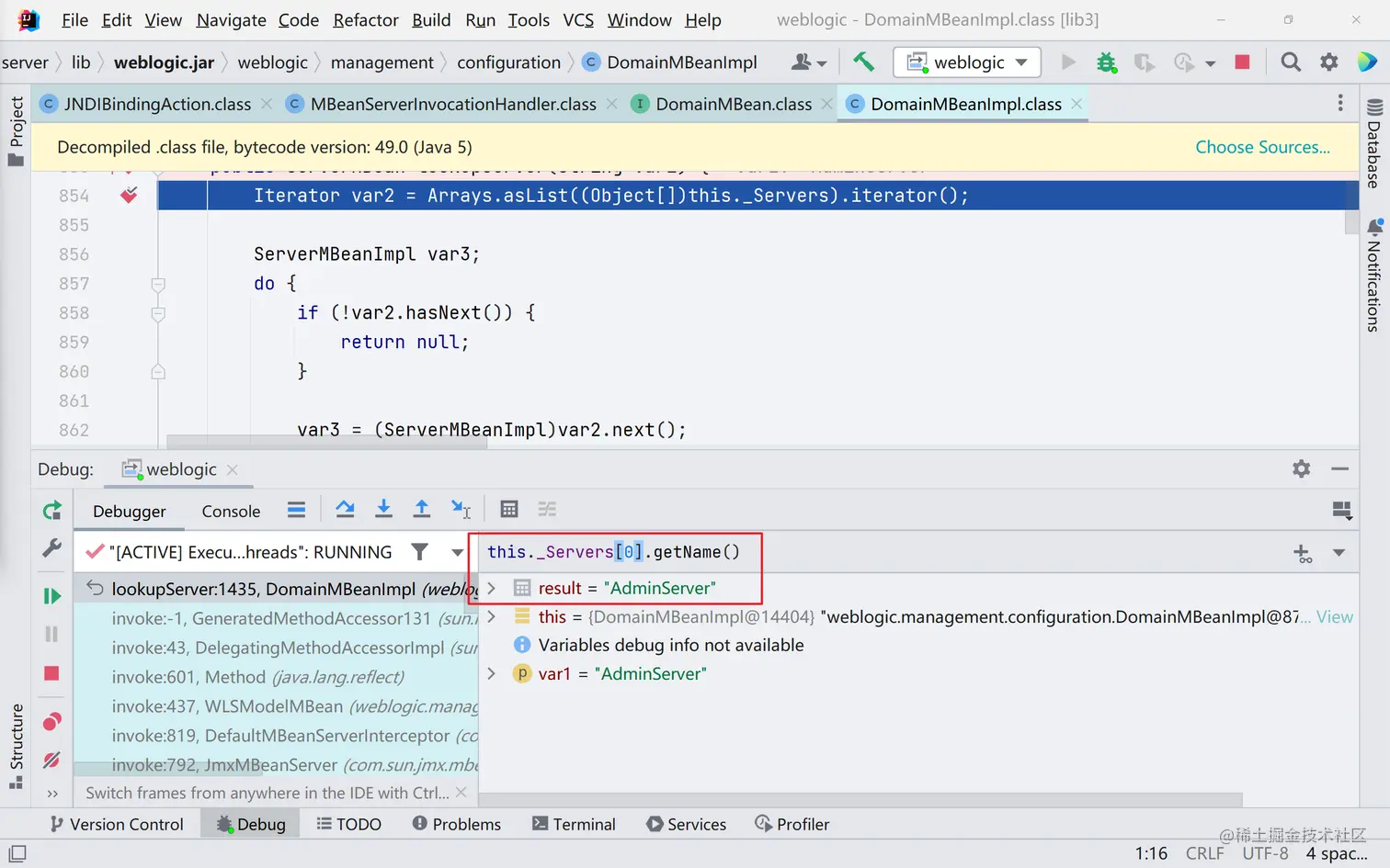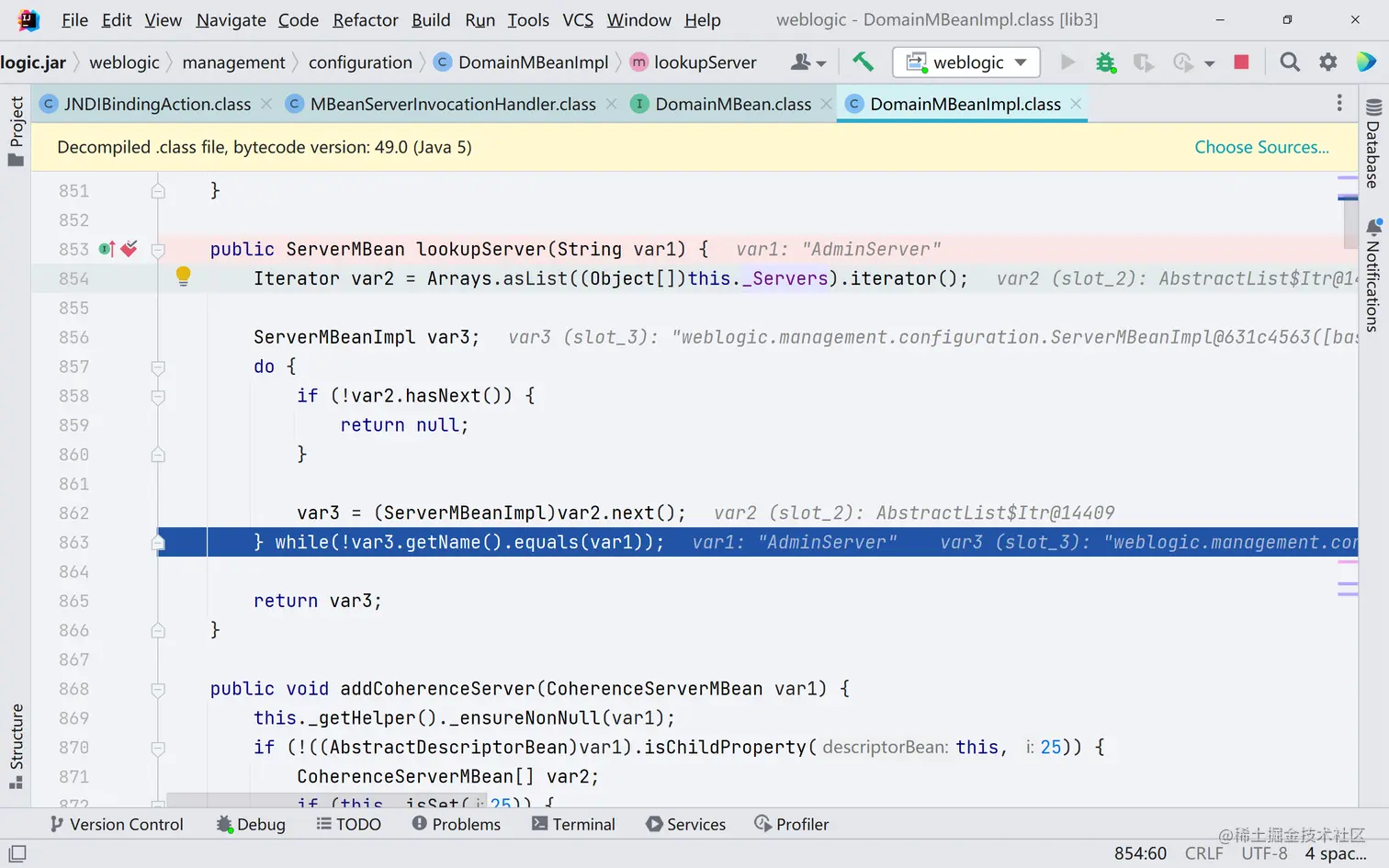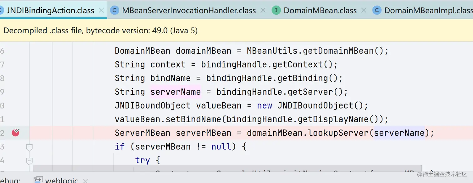 实际上这里是动态代理调用的,会自动跟进到 weblogic.management.jmx.MBeanServerInvocationHandler#invoke 下,其中 method 的值为 weblogic.management.configuration.DomainMBean#lookupServer,它的 method 代码逻辑在实现类当中,也就是 weblogic.management.configuration.DomainMBeanImpl#lookupServer