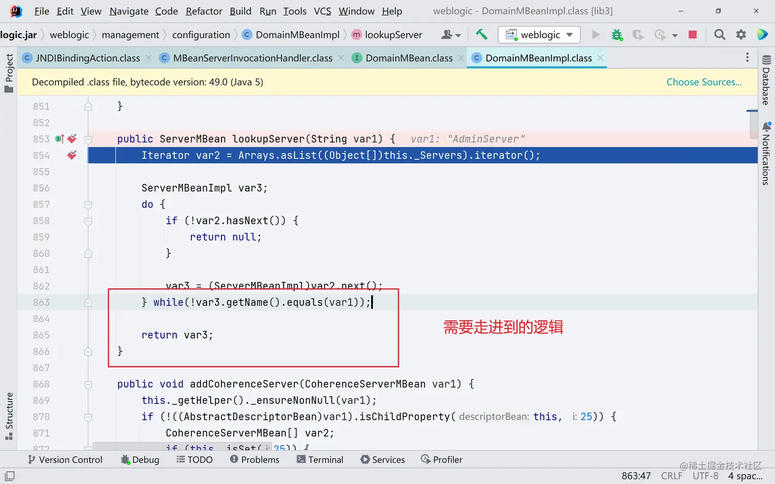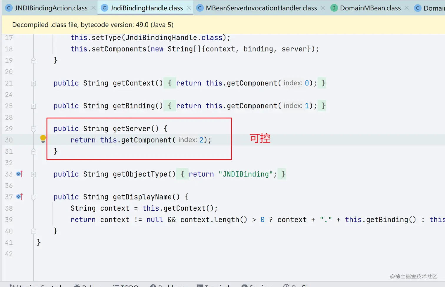 继续往下看,我们想要进入 JNDI 注入的那一段代码,需要满足两个条件,一个是 serverMBean != null,另一个是 c != null,我们进到 serverMBean 看一下代码逻辑