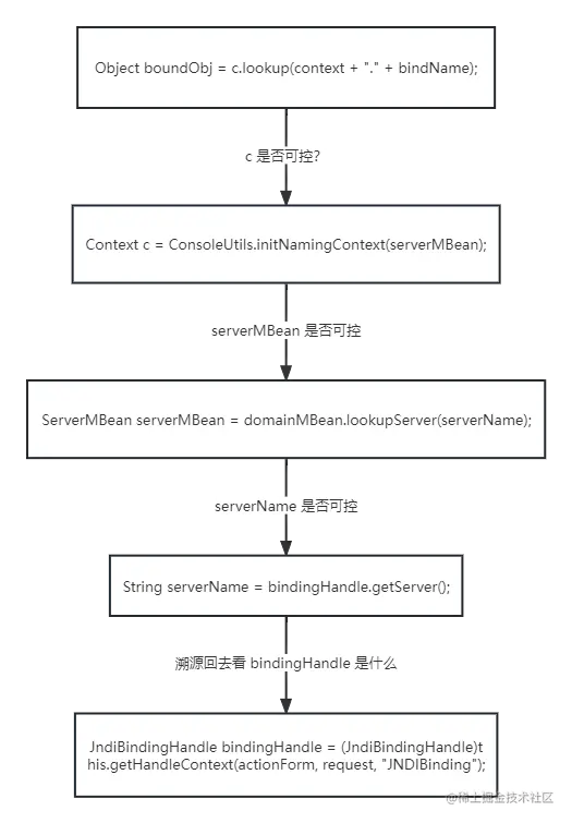 观察需要如何构造恶意 payload,c 是由 ConsoleUtils.initNamingContext(serverMBean); 得来,而 serverMBean 是通过 domainMBean.lookupServer(serverName); 得来,其中一系列关系我将会由下图说明