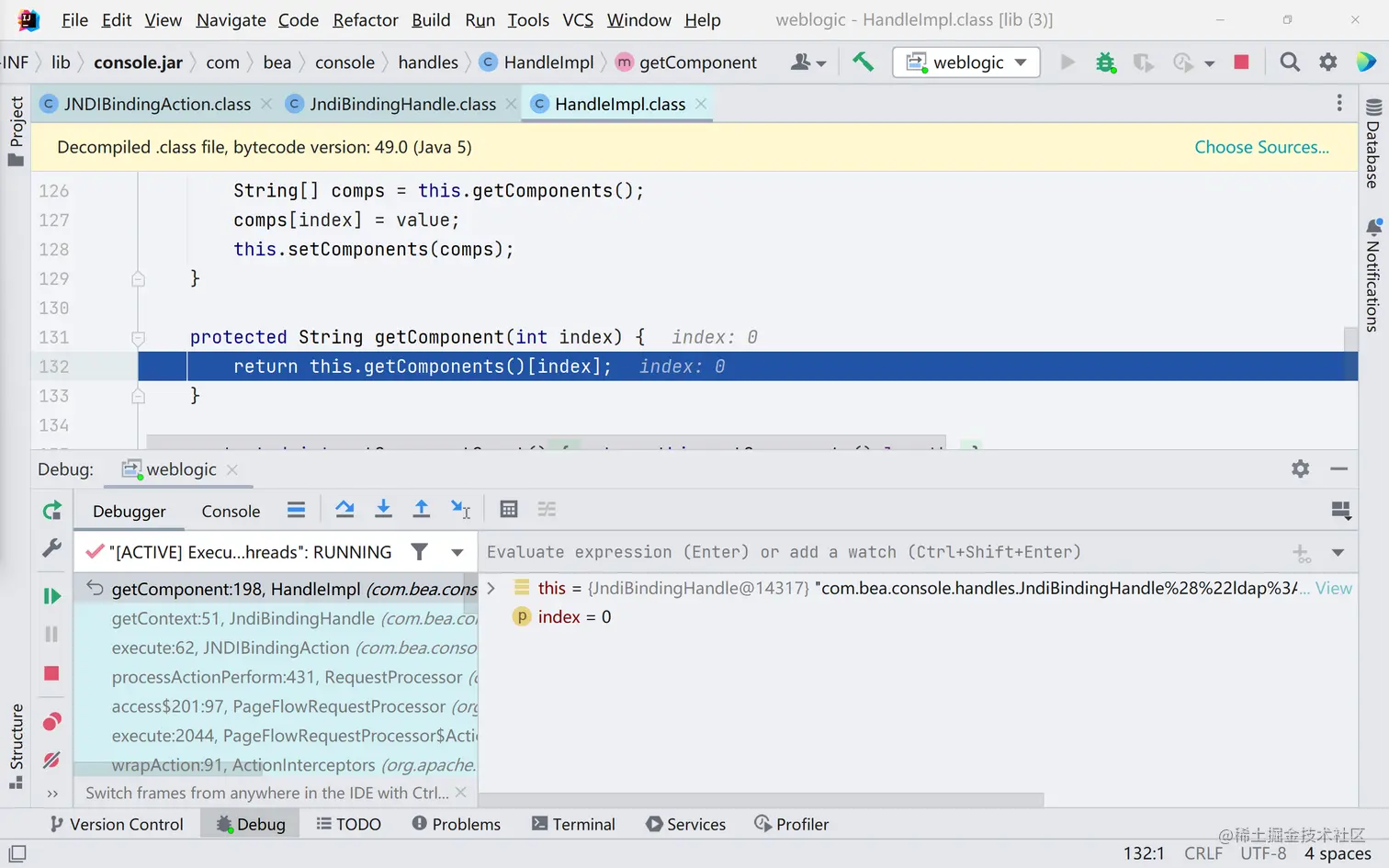 我们进到 JndiBindingHandle 类去看一下 set/getComponents() 的逻辑,先调用了 HandleImpl#getComponent