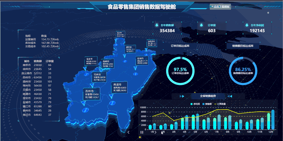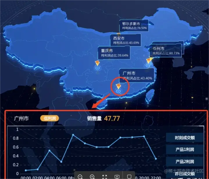 销售额分析大屏,展示各城市利润占比,销售量等数据,地图和下方折线图联动,可动态展示各城市的销售额和利润情况。用特效展示数据,可以更直观的带来更大的信息量。