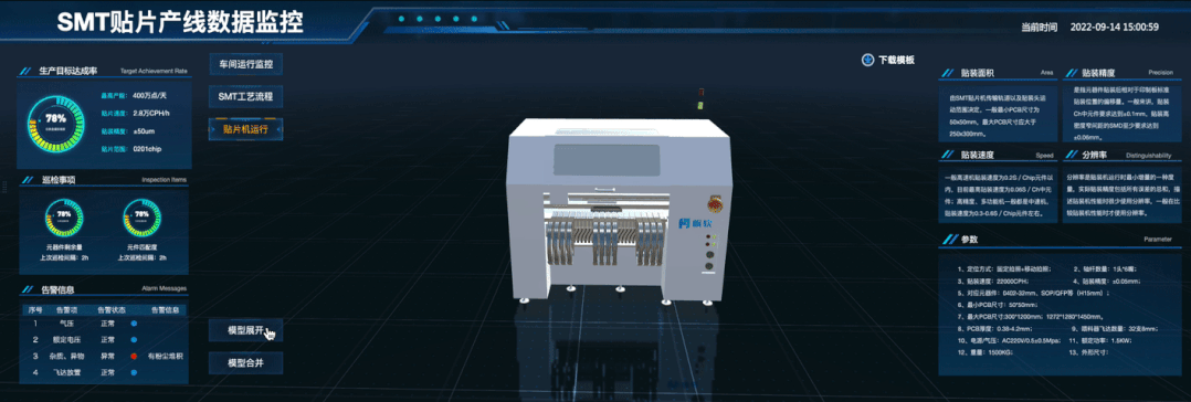 用立体视角进入工厂,并且可以点击单个建筑查看其所对应的指标。工厂机器运转情况,产品生产进度,原料耗用量等指标都能展示清晰直观。