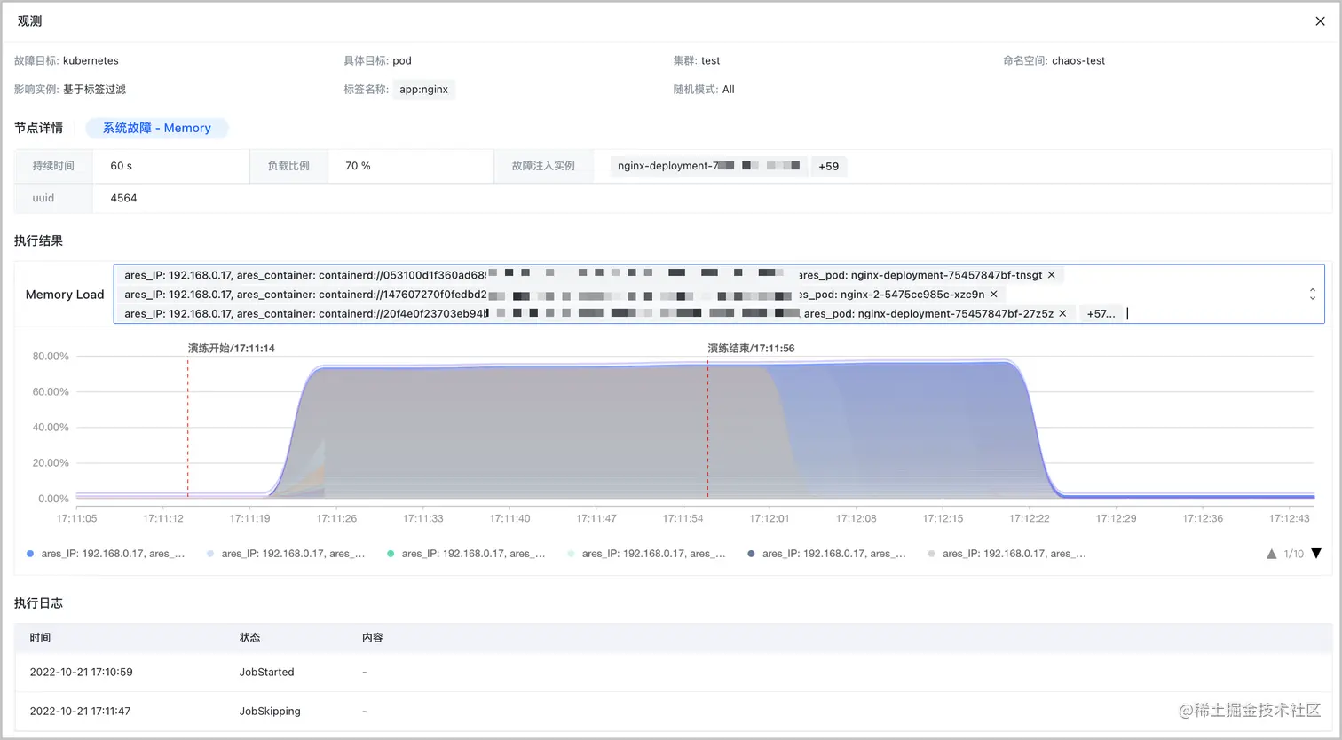 如上图为注入内存故障后,内存使用的数据。在 观测 页面查看当前实验场景的运行结果。目标 Pod 的 Memory 负载在故障注入的一分钟时间内,到达了预设故障参数值 70% 。实验结束后可以恢复到正常状态。