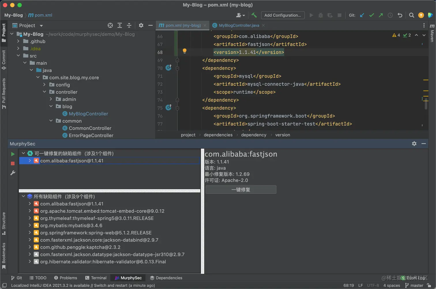 在IDE 中即可检测代码依赖的安全问题,并通过准确的修复方案和一键修复功能,快速解决安全问题。