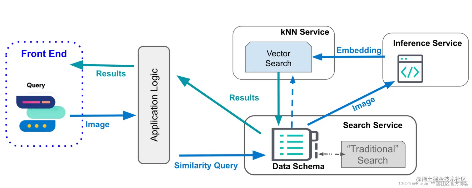 大多数用于搜索索引数据的搜索应用程序框架本身并不支持矢量(相似性)搜索所需的 k-最近邻搜索,也不支持应用 NLP 模型所需的推理。 因此,图像相似度应用程序需要与多个服务交互,除了核心搜索 kNN 服务。 如果涉及文本处理,它还需要与 NLP 服务交互,如图 1 所示。构建和维护起来可能很复杂。