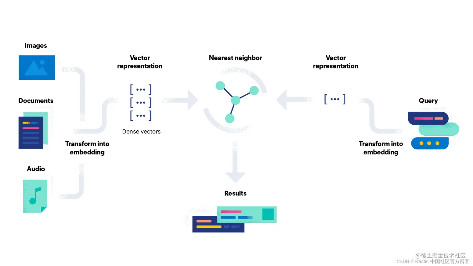 矢量搜索利用机器学习 (ML) 来捕获非结构化数据的含义和上下文。 矢量搜索使用近似最近邻 (ANN) 算法查找相似数据。 与传统的文本搜索(在 Elastic 中,基于 BM25 评分)相比,矢量搜索会产生更相关的结果并且执行速度更快(不需要极端的搜索引擎优化)。