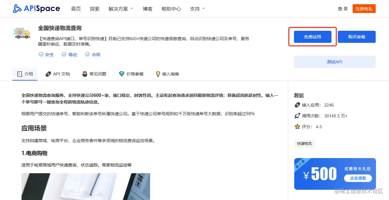 1.注册登录 APISpace,进入全国快递物流查询详情页,点击【免费试用】按钮即可领取免费次数