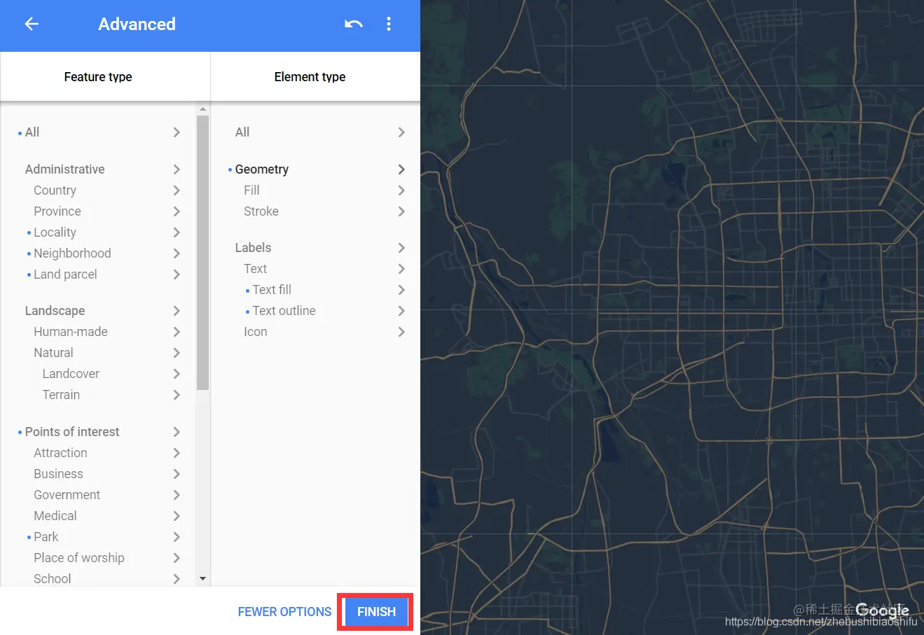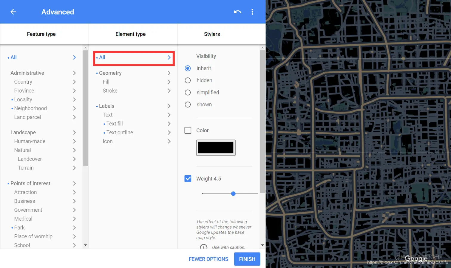 其中,弹出的界面分为三列,其中第一列为要素类型(包括行政区边界、兴趣点、道路、公共交通路线等),第二列为这一要素类型对应的地图元素(包括点、线、面、图例等),第三列则为这一地图元素的具体属性设置(包括填充颜色、要素粗细等)。例如,如果我们在第一列中选中了“Points of interest”中的“Park”——也就是地图中公园类型的兴趣点,那么第二列就是需要对公园类型要素进行修改的元素;再如果第二列选中了“Geometry”中的“Fill”,那么第三列就是公园类型要素在地图中所显示为几何形状时,在填充角度的属性。