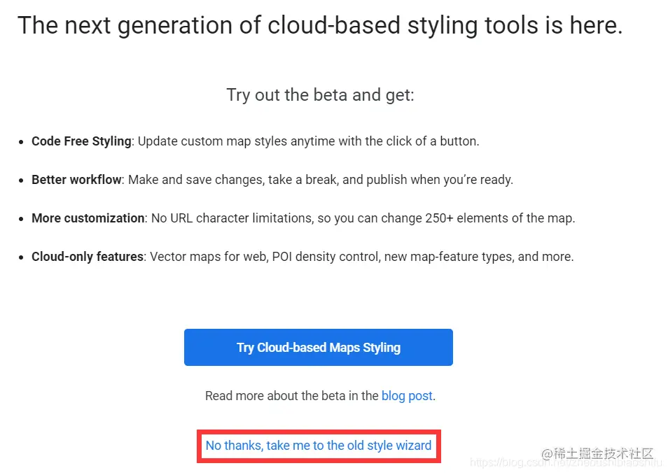 首先,进入Google Maps APIs网站。在弹出的窗口中我们可以看到,目前还可以基于谷歌云端硬盘进行地图样式设计;但原有的Google Maps APIs其实相对来说也还是很方便、简洁的,本文这里也就暂时先介绍Google Maps APIs。因此,这里我们选择最下方的old style wizard即可。