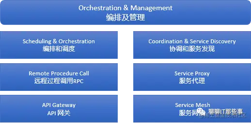 这一层主要负责容器平台的编排和调度工作。包括服务的发现治理、远程调用、服务代理、微服务治理等组件。