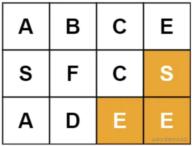 在这个对比过程中,我们会执行一些“错误的路径”。以下图为例,输入:board = [["A","B","C","E"],["S","F","C","S"],["A","D","E","E"]], word = "SEE";word的第1个字符是‘S’,那么我们会找到第2行第1列的‘S’,那么我们无论从它相邻的上、下、左、右都无法找到word的第2个字符‘E’,那么这个就是一条“错误的路径”。分析到这里,我们就很容易想到大致的解题思路就是——回溯。通过回溯我们才能从错误的路径中跳脱出来,继续去寻找矩阵board中的下一个字符‘S’,那么后续我们在第2行第4列找到了‘S’,然后发现可以找到一条“正确的路径”,就可以返回结果为true。