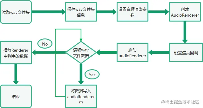 首先读取wav文件,通过读取到wav文件的头信息对AudioRendererOptions相关的参数进行设置,包括编码格式、采样率、采样格式、通道数等。根据AudioRendererOptions设置的参数来创建AudioRenderer实例(实际上是AudioRendererPrivate),后续的音频渲染主要是通过AudioRenderer实例进行。创建完成后,调用AudioRenderer的Start方法,启动音频渲染。启动后,通过AudioRenderer实例的Write方法,将数据写入,音频数据会被播放。