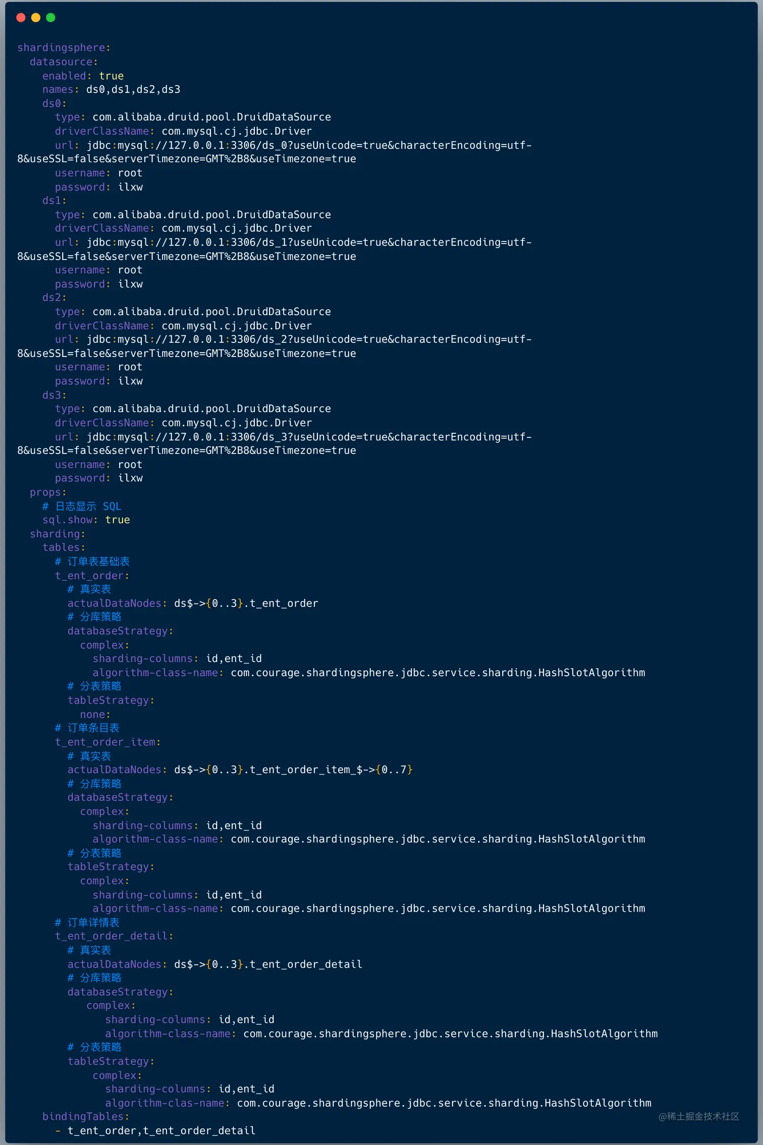 订单明细表的真实节点是:ds$->{0..3}.t_ent_order_item_$->{0..7} 。