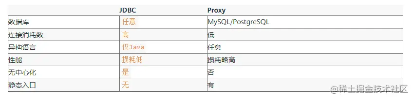当我们在 Proxy 和 JDBC 两种模式选择时,可以参考下表对照: