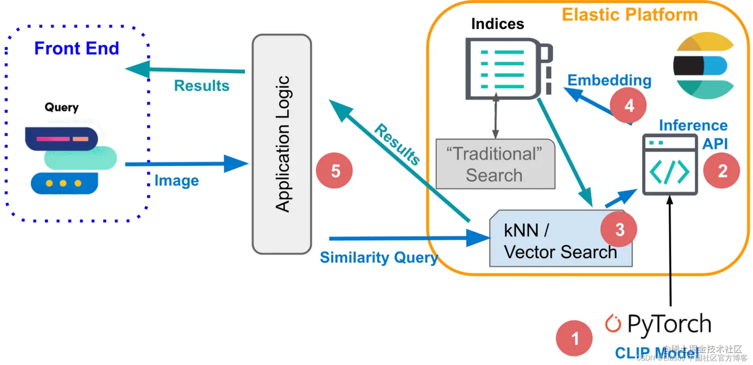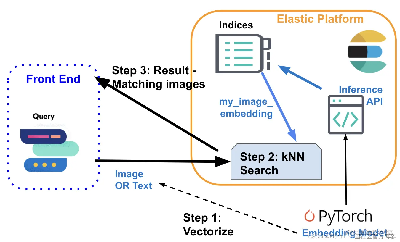 - 应用程序在 Elasticsearch 中启动 kNN 查询,它获取嵌入并返回其最近的邻居。