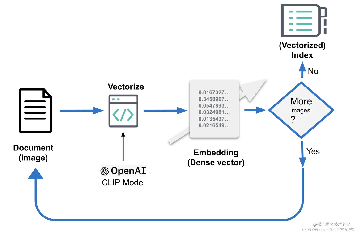 - 你的应用程序通过应用 CLIP 模型将图像矢量化,并将生成的嵌入存储为密集矢量。