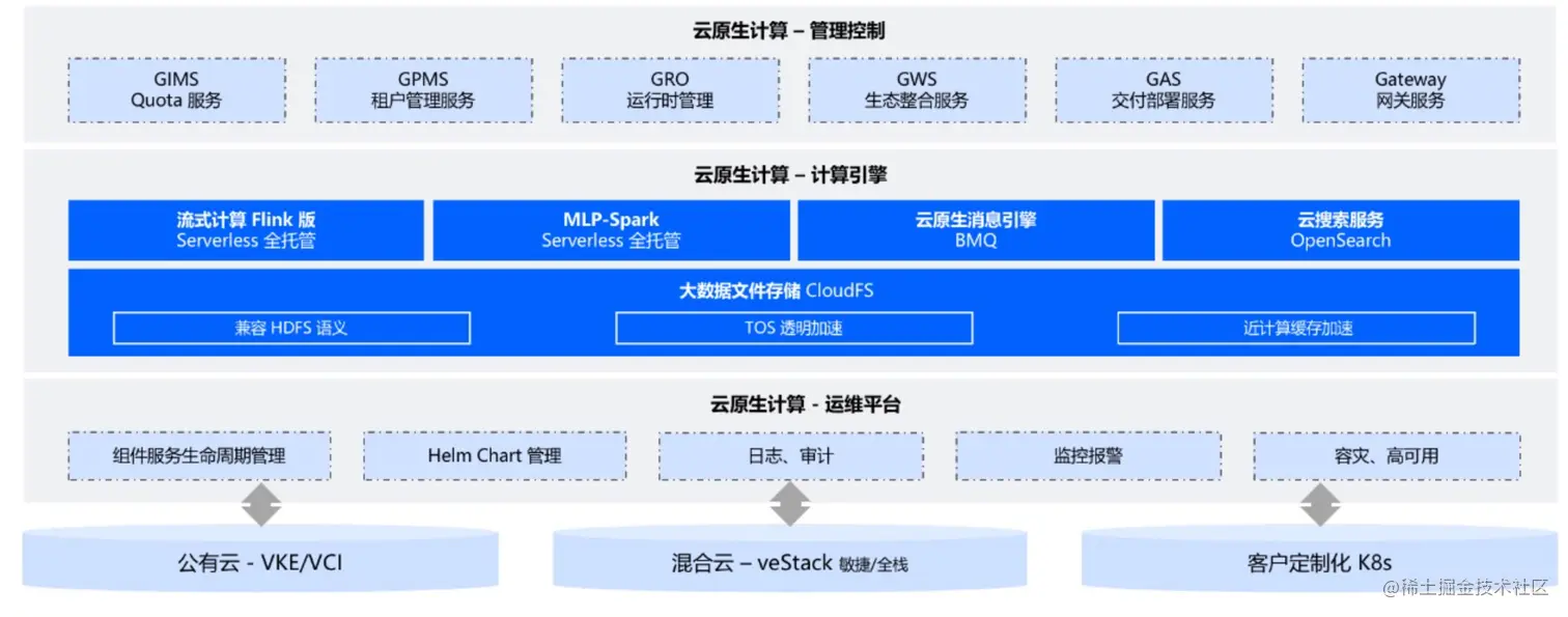 火山引擎云原生计算支持字节跳动内部今日头条、抖音、西瓜视频、幸福里、飞书等多项产品,为离线 ETL & 机器学习、AML、推荐、数仓、搜索、广告、流媒体、安全和风控等核心业务场景和中台体系提供存储、计算、资源调度等底层支撑。在负责支撑字节跳动内部的大数据计算、数据存储、中间件的同时,对企业用户提供同源的产品解决方案与服务。火山引擎云原生计算打造了从数据接入 BMQ / Kafka 到数据 ETL(实时 Flink、批式 Spark)再到数据存储和加速 CloudFS 、云搜索服务等一站式服务,同时提供 OpenStudio 管控(多租户隔离、访问控制、计量计费等)和 OpenOps(服务生命周期管理、安装部署、容灾高可用)运维交付平台。