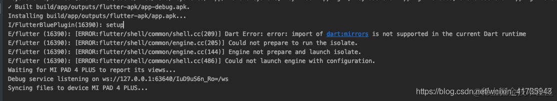 Flutter BUG解决记录 Antu58 2023-03-02 288 阅读1分钟 error: import of dart:mirrors is not supported in the current Dart runtime 解决方案: 很可能不是主工程导致的问题,而是代码中引入了某个库或文件,移除即可。由于日志并没有告知是哪个库导致的问题,我是通过新旧版本对比逐一排除确认问题库。 最终删除如下代码解决问题 import 'package:ripp_link_core/util/source_gen/generator/source_gen_ext.dart';