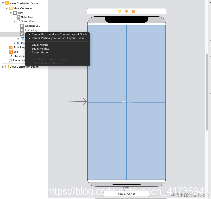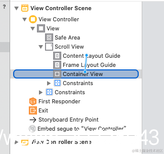 鼠标指到Content Layout Guide,按住右键拖到ContainerView,松手选中前两项就好