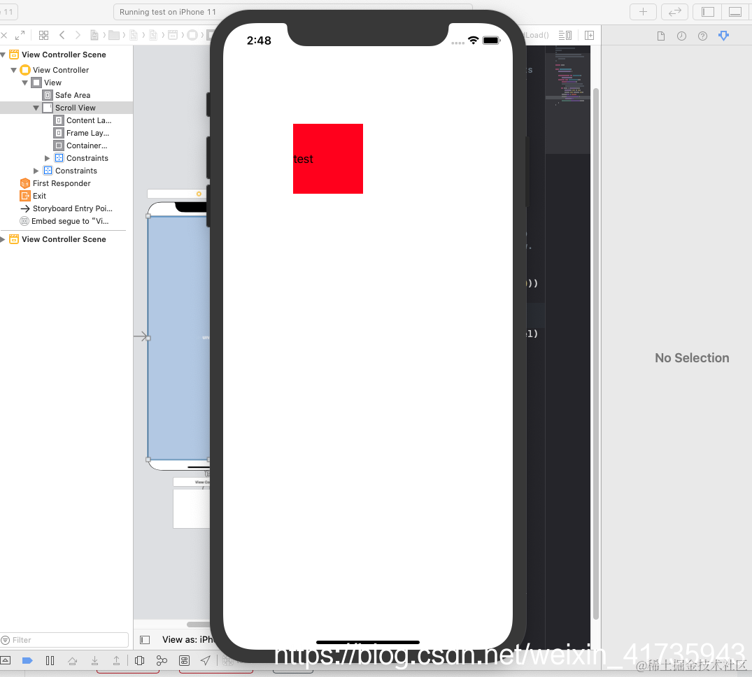 这里报错就消失了,用代码向ScrollView中添加一个label看看布局是否正确,以及约束是否生效