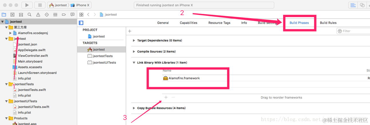下载Alamofire后把xcodeproj文件拖进去,然后如图配置