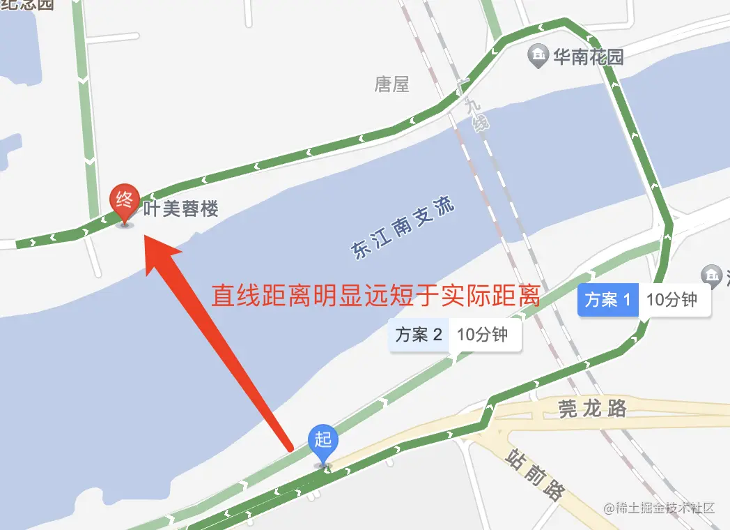 根据两点之间计算和订单的距离是最简单、粗暴的方法,但是这个又会带出另一个问题,针对一些复杂地形,只是计算直线距离会带来极大的误差(如遇到河流,桥梁等等,尤其像重庆这样地形复杂的城市),如图所示: