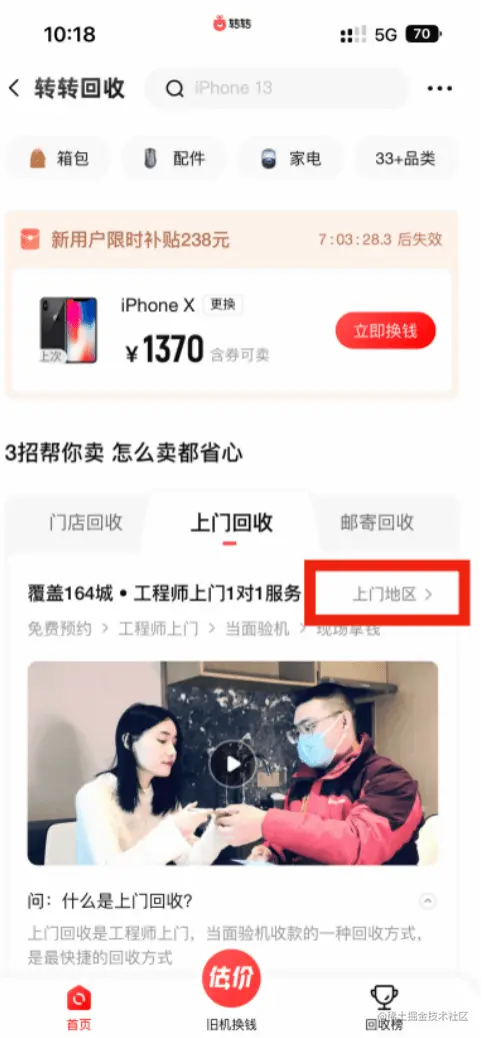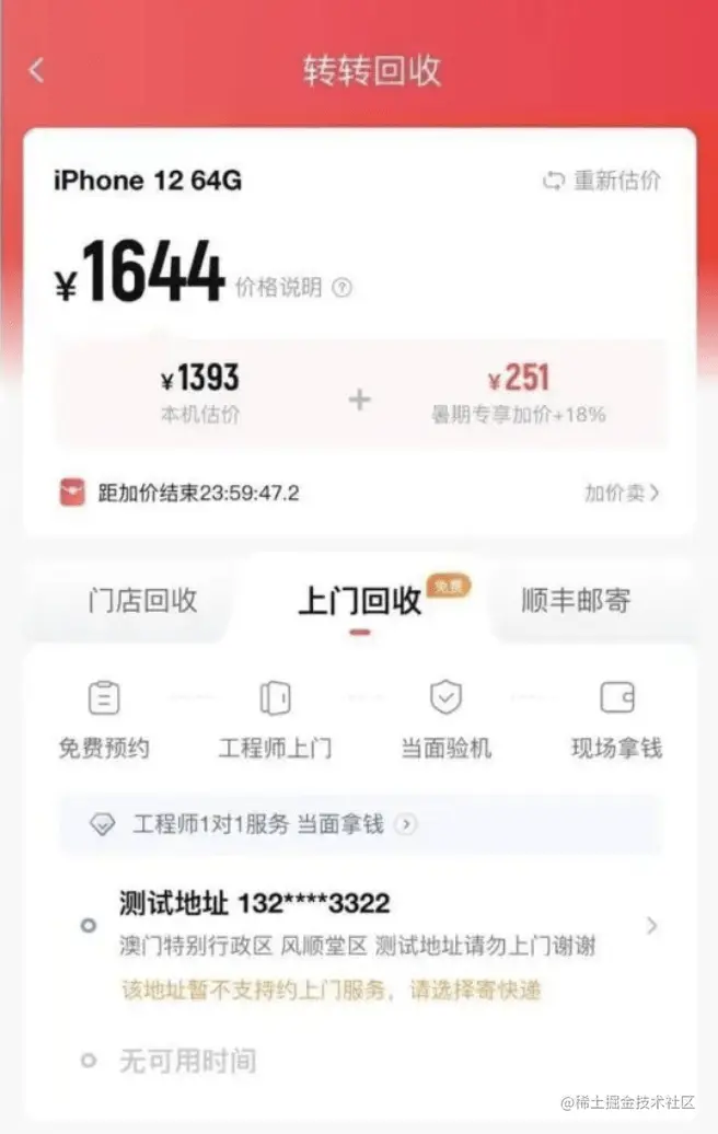 用户打开转转APP回收页,根据用户的IP信息和GPS(用户授权情况下)获取所在城市(或地址)是否支持上门。