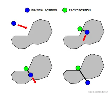 上图说明了虚拟代理的运动,因为触觉设备的位置发生了变化。代理的运动试图始终朝着目标移动。当畅通无阻时,代理直接向目标移动。当代理遇到障碍物时,无法直接移动,但代理仍可以通过沿一个或多个约束曲面移动来缩短到目标的距离。选择运动以局部最小化到目标的距离。当代理无法减少其与目标的距离时,它将停止在本地最小配置处。力是通过对触觉设备和代理位置之间的虚拟弹簧进行建模来计算的。弹簧的刚度在材料属性中定义。