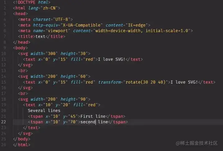 这里你可能会问:svg 里为什么不用 p 标签来显示文本呢?我们知道,svg 是在一个画布里绘制图形,text 也是绘制的对象。这样,我们就可以使用 svg 的一些专有特性控制文本了,比如旋转文本。