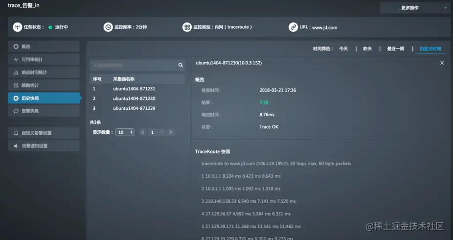 - TraceRoute快照:查看TraceRoute返回结果,包括最大跳数、数据包大小和跳转路径。