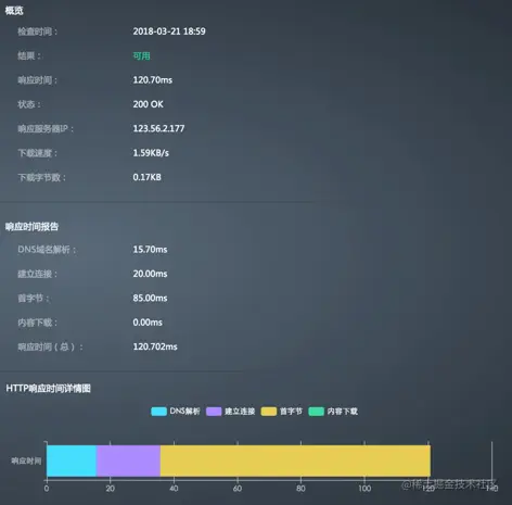 - 概览:包括检查时间、检查结果、响应时间、监测点状态、响应服务器IP、下载字节数和下载速度。