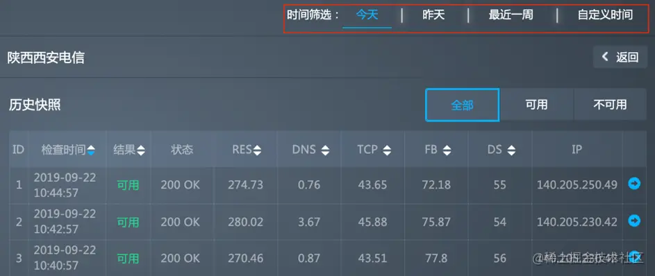 您可以按检查时间、使用情况和响应时间等排序历史快照;也可通过使用情况(即是否可用)来筛选历史快照。