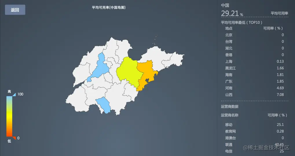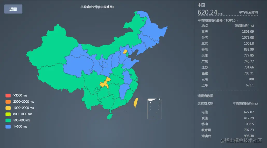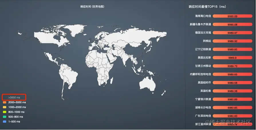 单击地图中的图例隐藏对应颜色的区域,如平均响应时间在全国3000ms以上的区域。