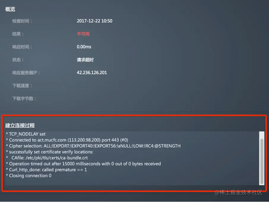 - 检查结果为不可用时,显示概览信息。如果当前的监控任务开启了ssl证书认证,会显示建立连接过程,显示系统记录的证书下载、认证及连接建立过程的快照信息,方便客户快速准确定位故障问题。