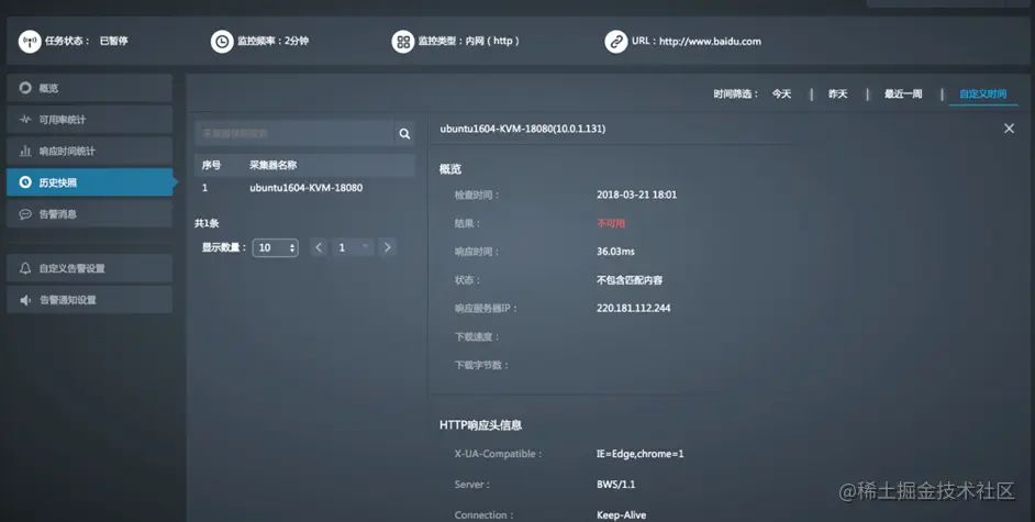 - HTTP响应头信息:查看HTTP响应头信息,例如Server、Date、Connection等,每个监控任务的HTTP响应头信息会略有不同。