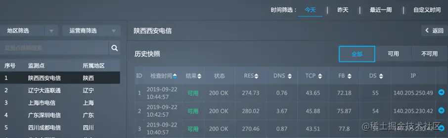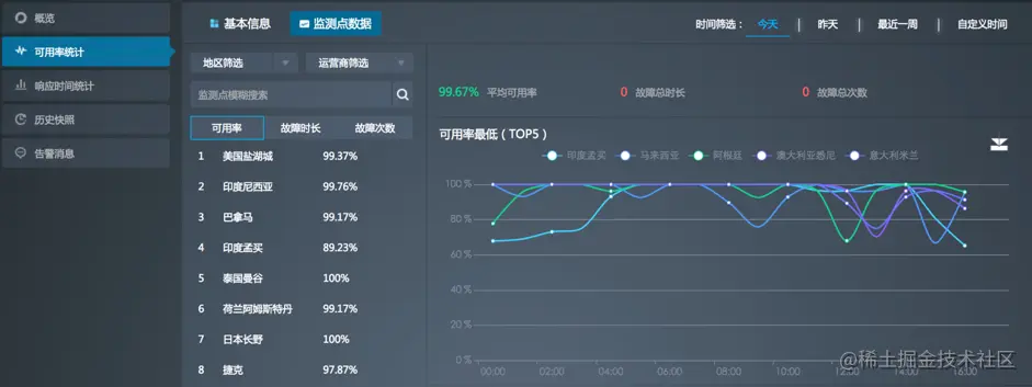 您可以通过地区和运营商来筛选监测点,可按可用率、故障时长或故障次数来排序,同时可通过模糊搜索来查找监测点。