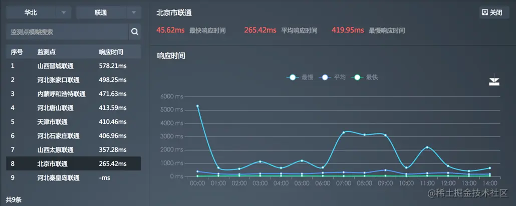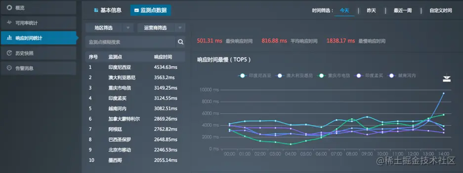 响应时间统计页面展示响应时间统计结果概况和监测点响应时间的详细分析。
