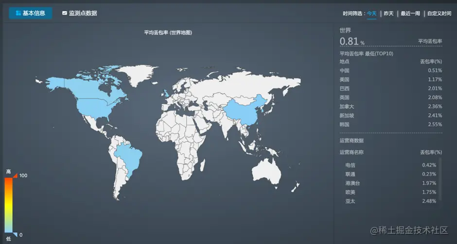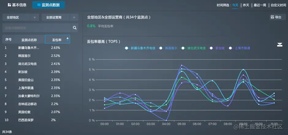 丢包率统计页面可展示丢包率概况与监测点详细统计数据。