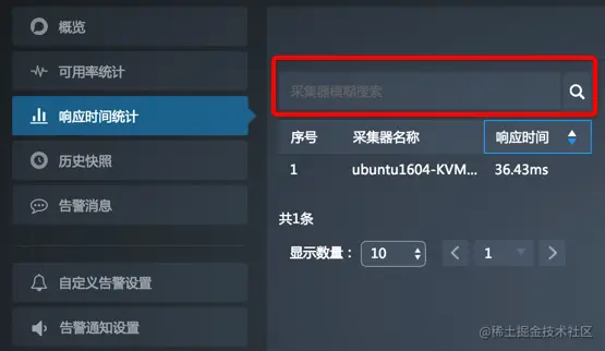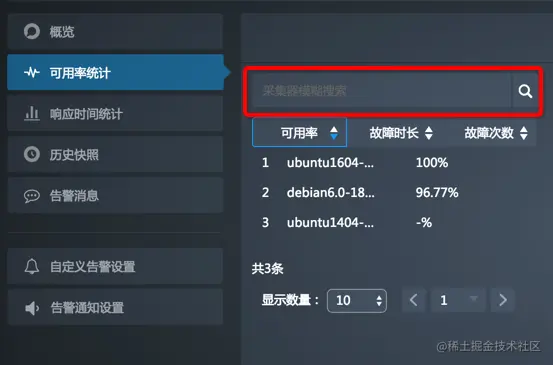 - 您可以按可用率、故障时长或故障次数来排序,同时可通过模糊搜索来查找采集器。