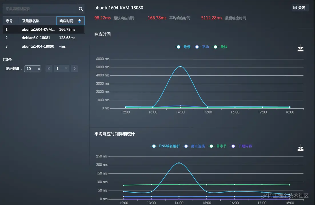 - 单击采集器能够查看具体每个采集器的最快响应时间、平均响应时间、最慢响应时间、响应时间(最慢、平均、最快)变化趋势、平均响应时间详细统计、各时段响应时间和响应时间分布。