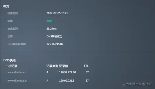 - 概览:包括检查时间、检查结果、响应时间、监测点状态和DNS解析服务器。