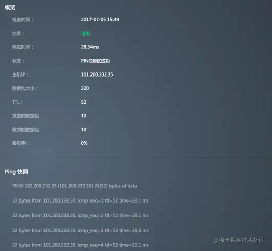 - 概览:包括检查时间、检查结果、响应时间、监测点状态、丢包率。