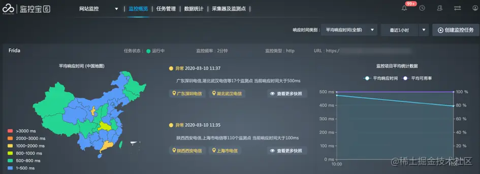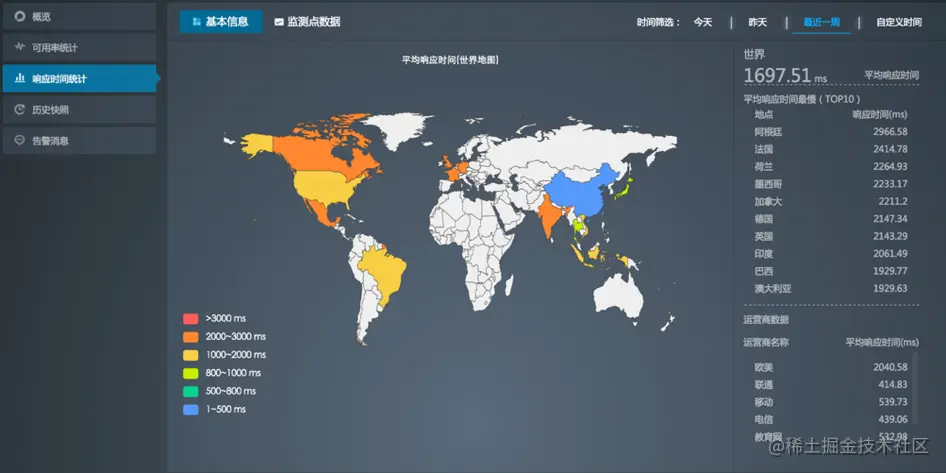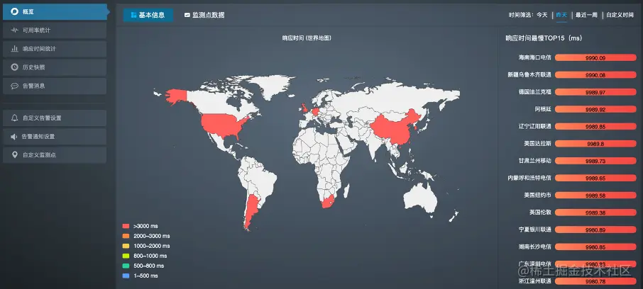 - 如果监控任务中设置了海外监测点,您看到的是平均响应时间世界地图;如果只设置了国内监测点,则您看到的是中国地图。